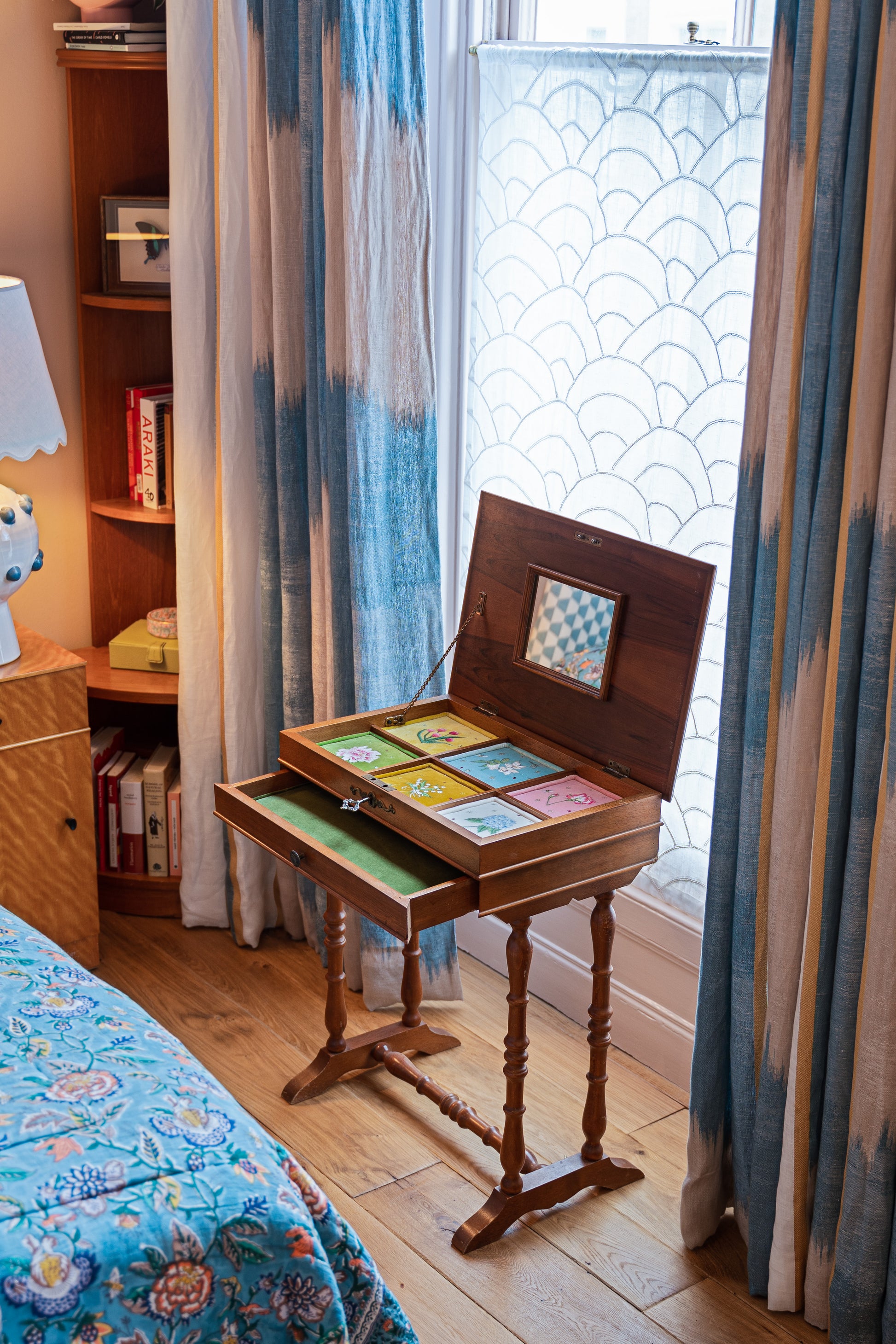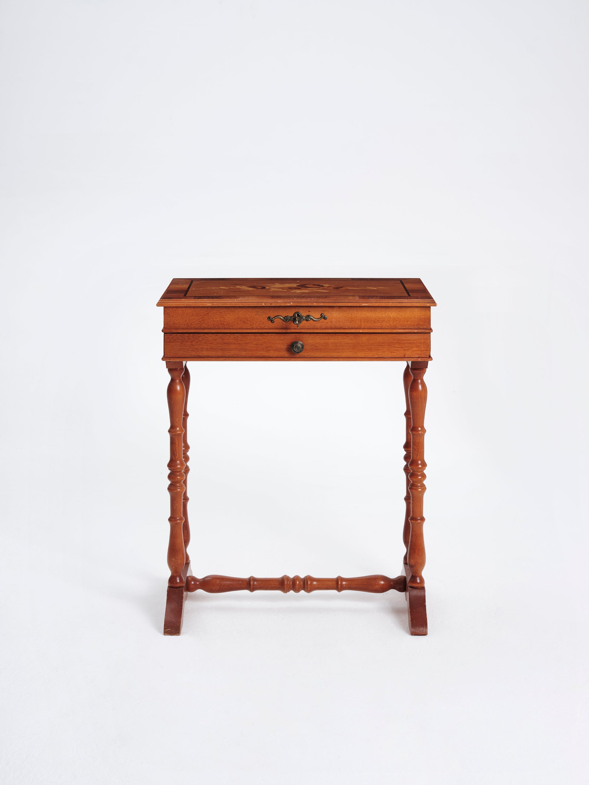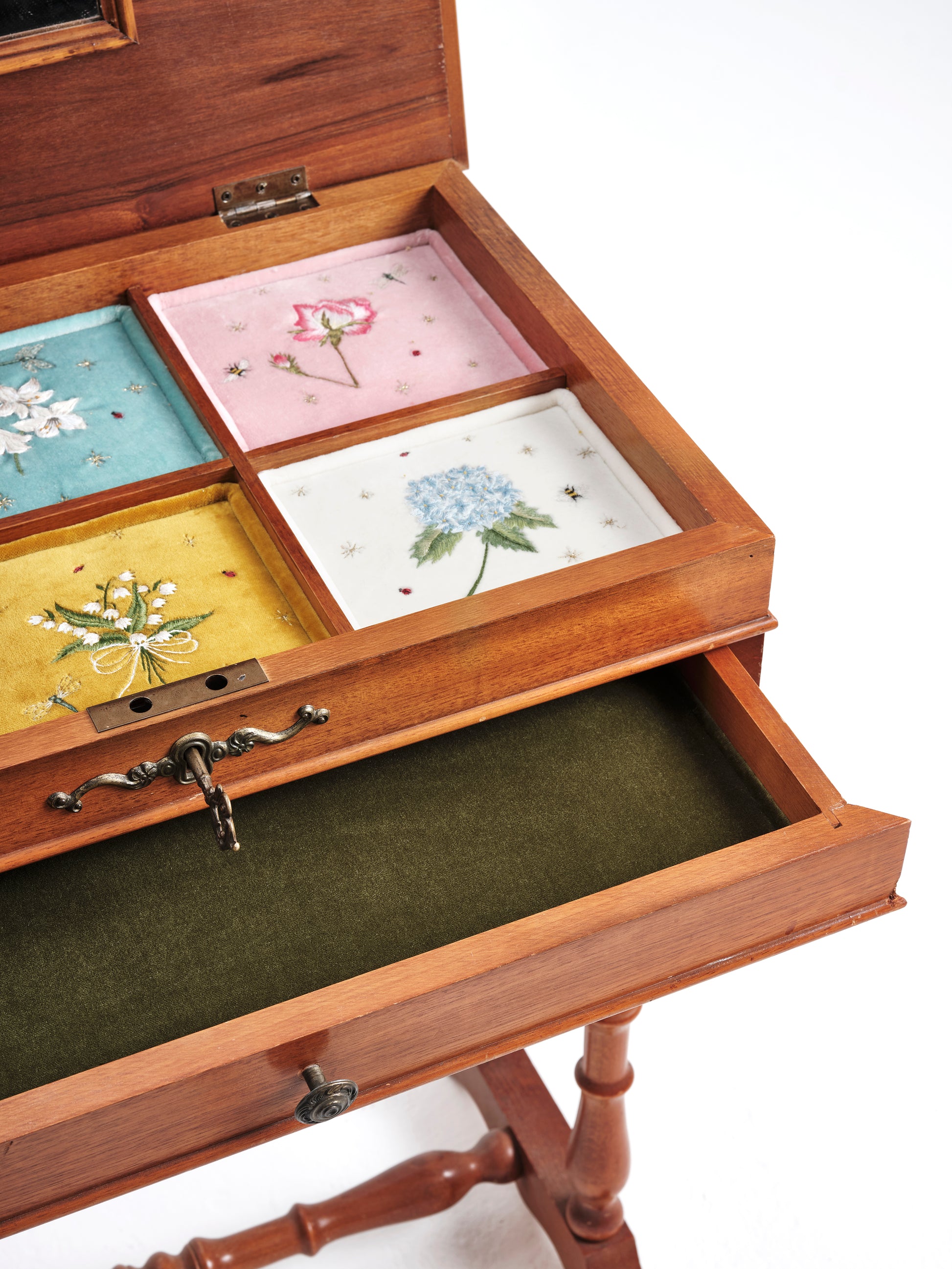 Measuring 69cm in height, 36.5cm in depth, and 56cm in width, this jewellery box table offers a perfect balance of size and space. It features six compartments, each adorned with a uniquely coloured lid and captivating flower design.
